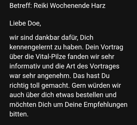 Die Investition in die Vitalpilze und somit in meine Gesundheit hat sich absolut gelohnt! Ich kann Doe mit ihrer Leidenschaft für die Naturheilkunde nur empfehlen und bin froh, dass ich mich auf etwas „Neues“ eingelassen habe. Vielen Dank, liebe Doe, für deine umfangreiche mykotherapeutische Beratung! Ich wünsche dir für die Zukunft alles, alles Gute noch viele weitere aufgeschlossene und zufriedene Kunden!